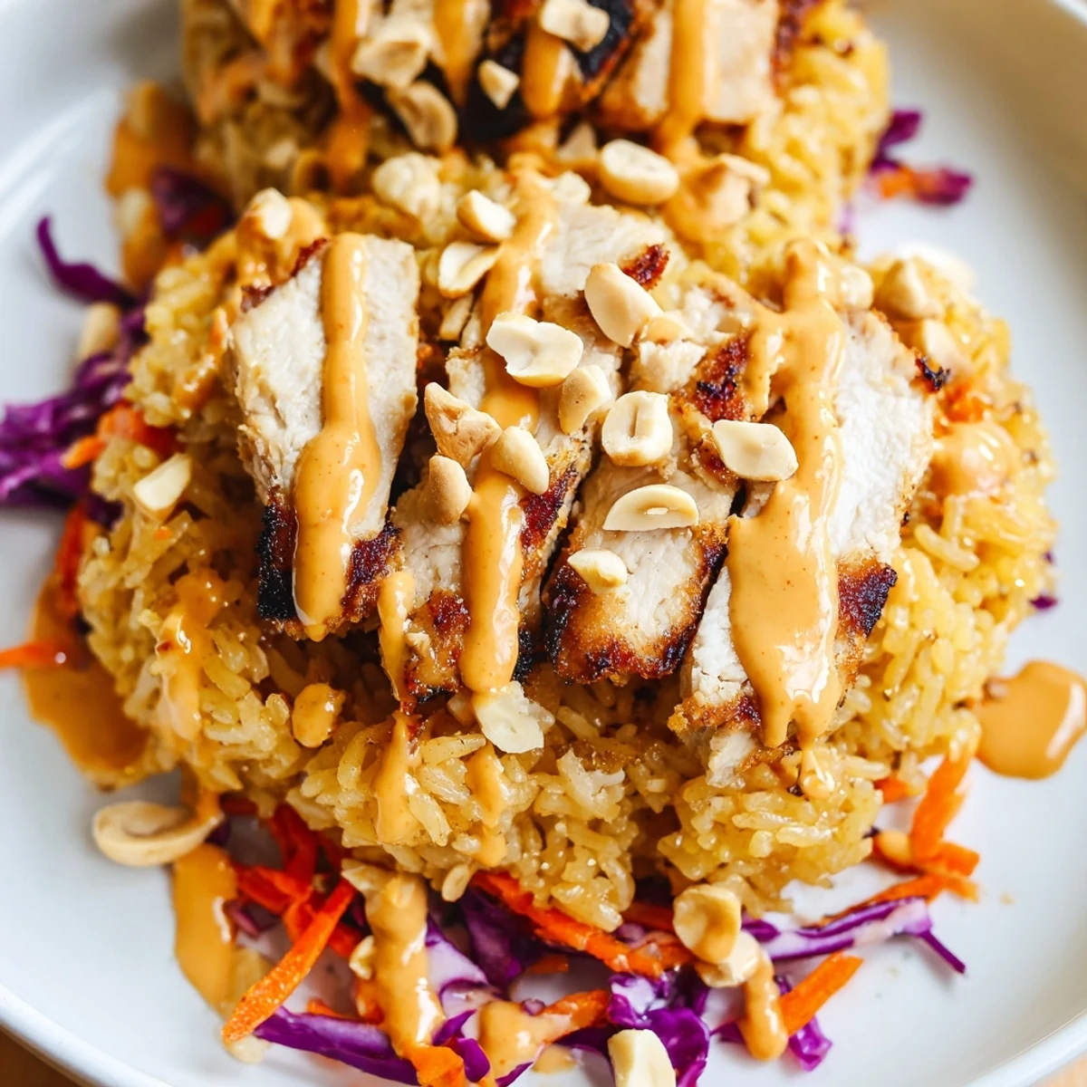 This vibrant bowl combines crispy golden rice squares with succulent seasoned chicken breast, bringing together satisfying crunch and tender protein. Fresh shredded vegetables including romaine, purple cabbage, cucumber, and julienned carrots add color and crisp texture.