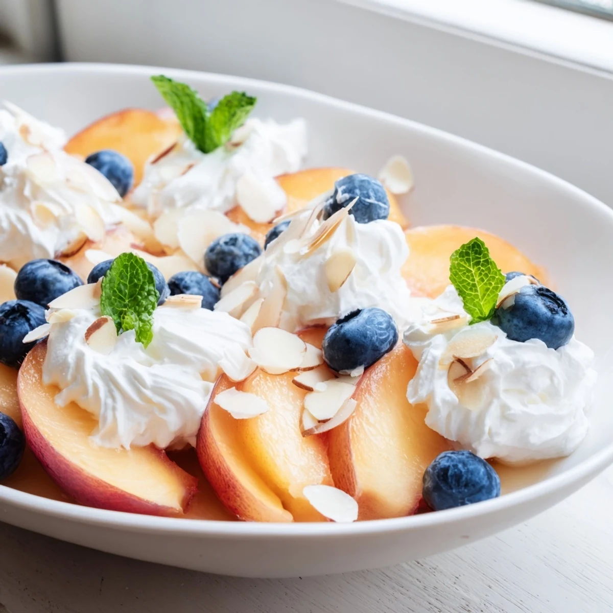 The velvety whipped cream gets its subtle sweetness from powdered sugar and pure vanilla extract, perfectly complementing the natural sweetness of fresh peaches. Fresh mint leaves add a bright finish, while optional blueberries bring vibrant color and extra flavor dimension.